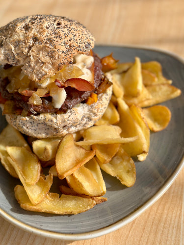 MANZO BURGER | burger di scottona con pancetta, zucca brasata, gorgonzola, chutney di mela verde, servito con patate fritte e pane artigianale ai semi