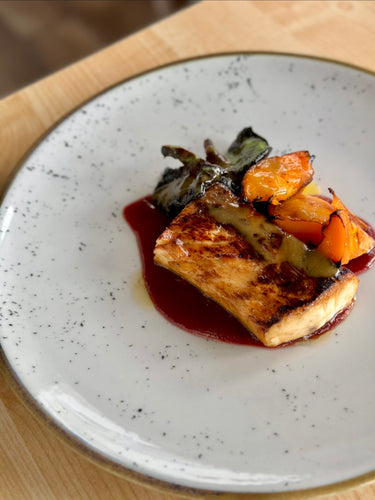 TRANCIO DI RICCIOLA con zucca brasata, funghi shiitake e riduzione di melograno