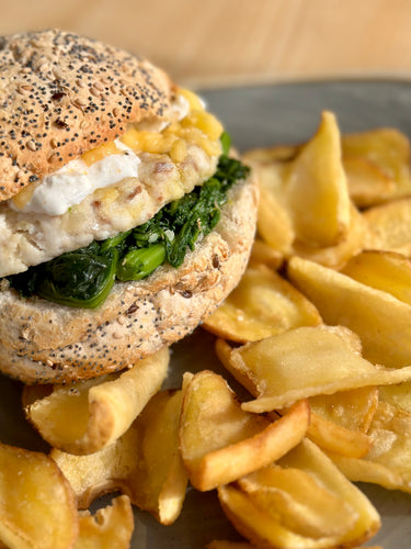 FISH BURGER | burger di spigola con cime di rapa, burrata e crema di limone, servito con patate fritte e pane artigianale e semi
